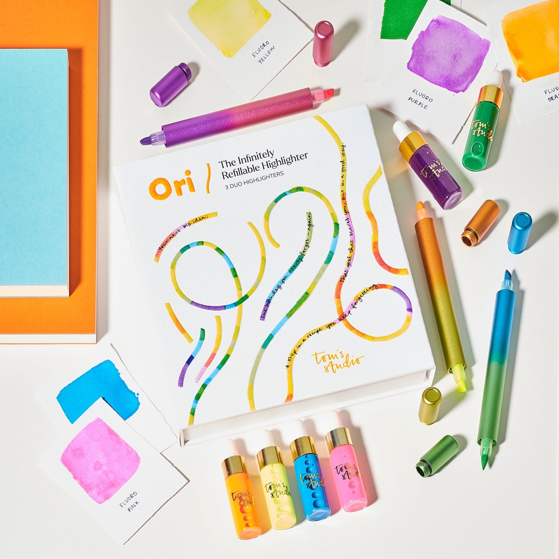 Nacimiento de la idea: Ori partió de un concepto sencillo: Los subrayadores son geniales. Son llamativos, impactantes y aportan claridad instantánea a la página. Pero también son un desperdicio. Desechables. Se han fabricado más de 2.600 millones de subrayadores de plástico desde 1971, y cada uno de ellos acaba en el vertedero. Pensamos que tenía que haber una alternativa mejor. Porque, francamente, las ideas brillantes merecen algo mejor. Así que reinventamos el bolígrafo de uso diario desde cero: un objeto alegre, recargable, modular y realmente emocionante de usar. Un bolígrafo diseñado no solo para respuestas finales impecables, sino también para los momentos intermedios, más espontáneos: los bocetos, las notas, los subrayados, las ideas brillantes. Un subrayador reinventado. El rotulador fluorescente Ori combina una punta biselada japonesa de gran suavidad con tinta fluorescente recargable, creando una herramienta diseñada para durar toda la vida.